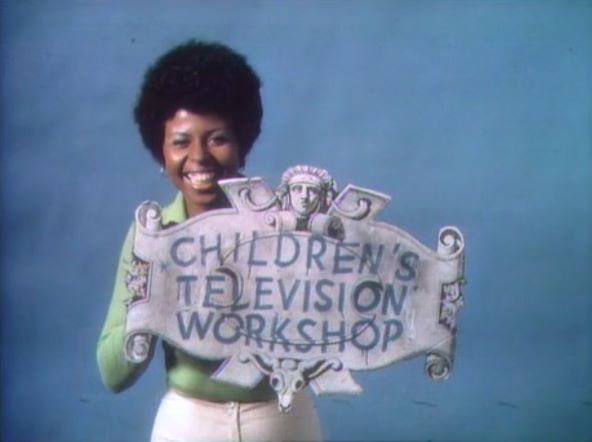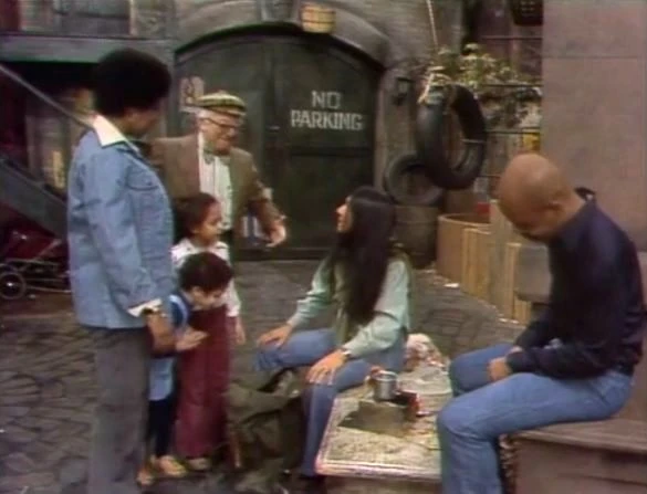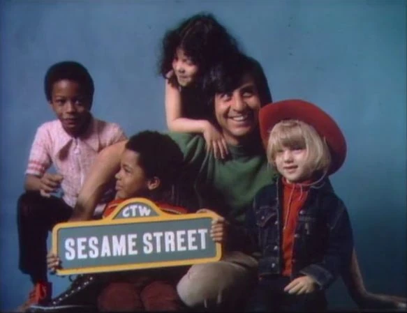 CLOSING SIGNS | Luis and the kids hold the Sesame Street sign, and Susan holds the Children's Television Workshop sign. |
