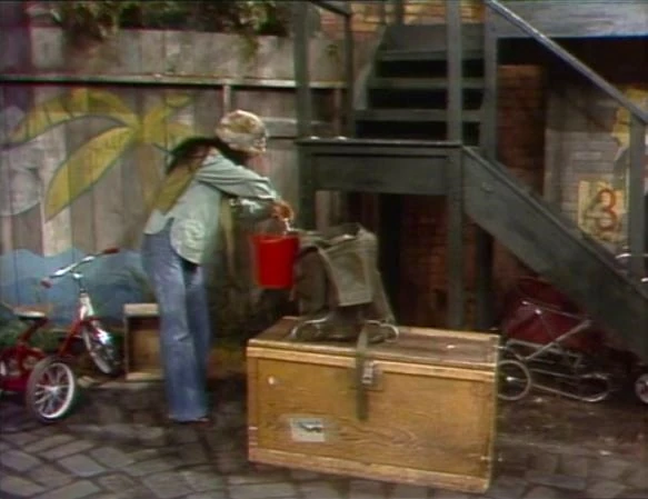 SCENE 1 | Back from a long trek, Buffy finally reaches Sesame Street. She visits Hooper's Store for some breakfast, but itβs so early in the morning that the store isnβt open yet. She goes over near the garage where she gets some water from a nearby hose and bucket to wash her face and comb her hair. She then fixes herself some instant coffee with her little camp stove from her backpack, as well as taking a piece of whalebone from her hat to skewer some bread to toast up. Gordon, Susan, Mr. Hooper, and a couple of kids smell the food and decide to join Buffy for breakfast. |