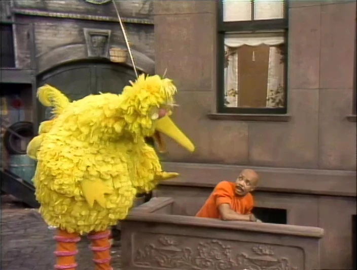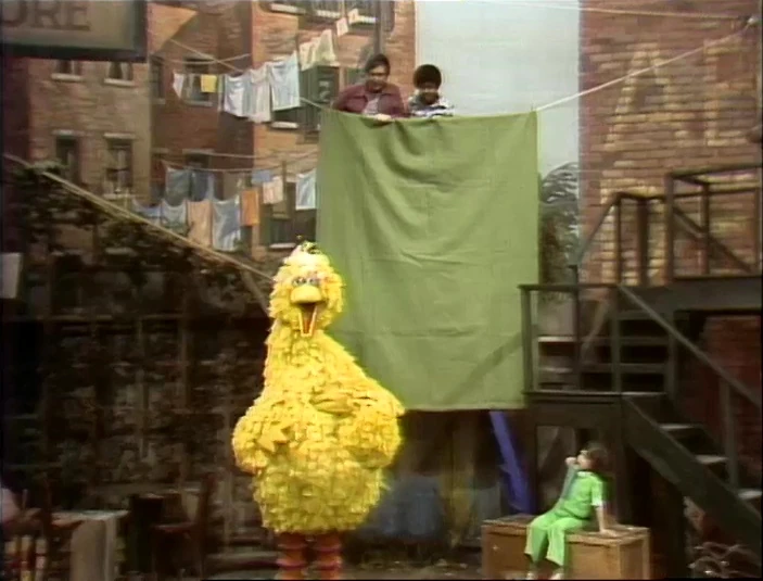 SCENE 1 | Walking toward Hooper's Store, Big Bird frets about being so tall and wonders what it would be like to be short like everyone else. He sees Mr. Hooper through the window, surprised to see how tall he's become; it turns out he's just standing on a stool to feather-dust the top of his shelf, making him look taller than Big Bird. Big Bird then sees Bob and Susan hanging a giant sheet on the laundry, making them look taller. Big Bird fears that he is shrinking until Bob and Susan move the sheet to reveal they're both standing on a ladder. They reassure him that they’re all still the same size, and it's okay to be either short or tall. |