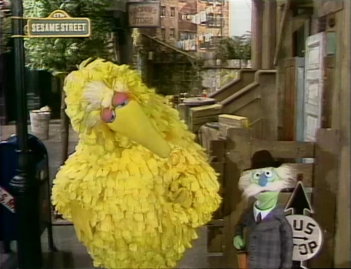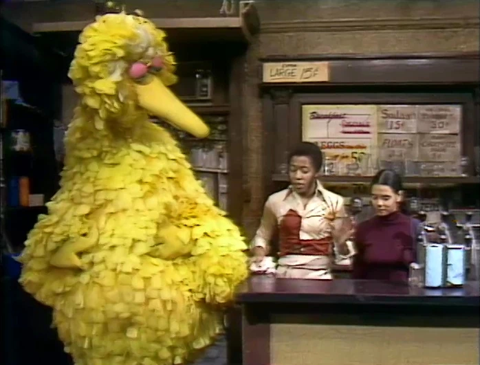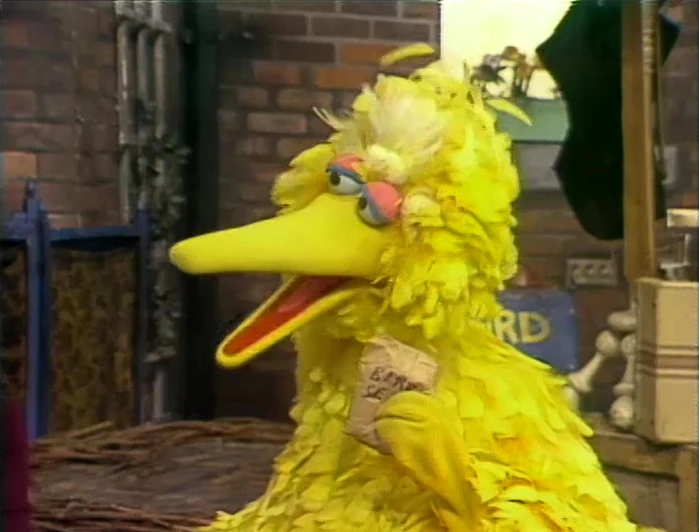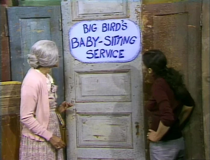 SCENE 4 | Maria and Grandma stroll down the block, when they notice a sign now hanging on the door of Big Bird's nest - "Big Bird's Baby-Sitting Service." Inside, Big Bird tells them he's starting up a new business to earn some extra cash. The grown-ups ask him how he would put a baby to sleep; Big Bird's method would be loudly tricking the baby into thinking it's nighttime. His other care-taking ideas include tickling or telling a joke to the baby to get them to stop crying and feeding them birdseed when they're hungry. Maria breaks it to him that he's not old or responsible enough to be in charge of taking care of an infant. Big Bird declares he will be a lawyer instead. |