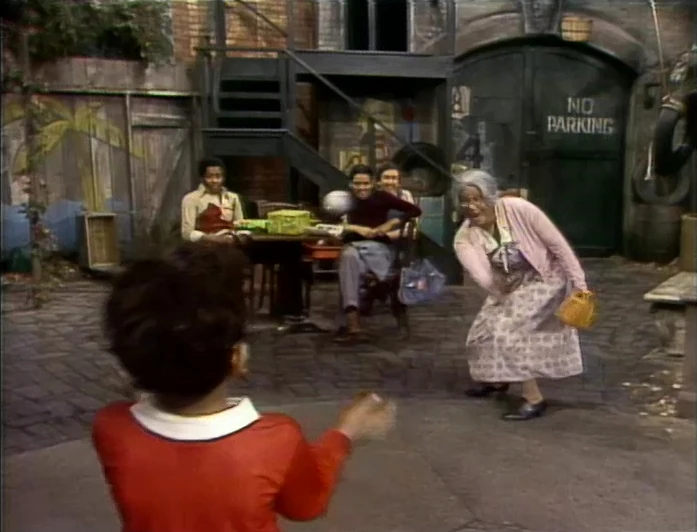 SCENE 1 cont'd | Big Bird positions himself at the bus stop, just in time for a bus to arrive. He stops an elderly Anything Muppet (Jerry Nelson), who fits the description (down to having a grandson named David), but Big Bird realizes that the person is male, thus not a grandmother. He then stops an Anything Muppet woman (Nelson), buts finds she's much too young looking. An elderly human woman departs the bus, and Big Bird points her toward Hooper's, not realizing who she is. Maria gets David's attention, and he shares a reunion with his grandma. Big Bird inspects her for a moment and remarks to David, "You didn't mention that she was wearing a hat!" |