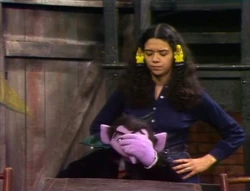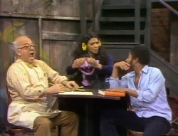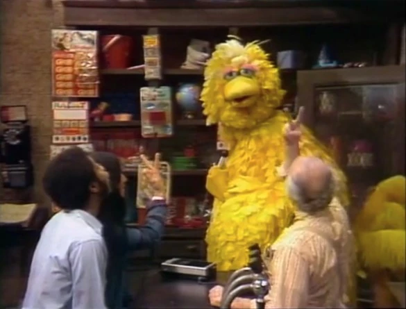 SCENE 1 | Big Bird enters Hooper's Store and is surprised to see Buffy singing a song without moving her mouth. She explains that what he heard was a recording she just made on her tape recorder, and shows how the machine works. She hands Big Bird the microphone for him to try it out and he says the alphabet, pausing nervously in-between some letters while Buffy, David, and Mr. Hooper quietly hint at the letters he forgets. When he hears the recording played back, he feels he has to cue his own voice whenever he pauses on the recording, thinking the machine doesn't know the alphabet. |