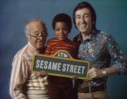 CLOSING SIGNS | Mr. Hooper, Bob, and a kid hold the Sesame Street sign, and Ernie and Bert hold the Children's Television Workshop sign. |