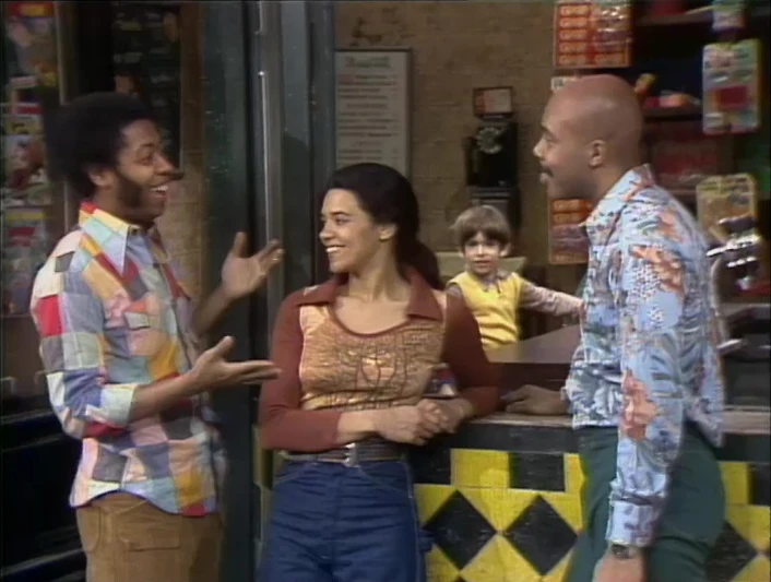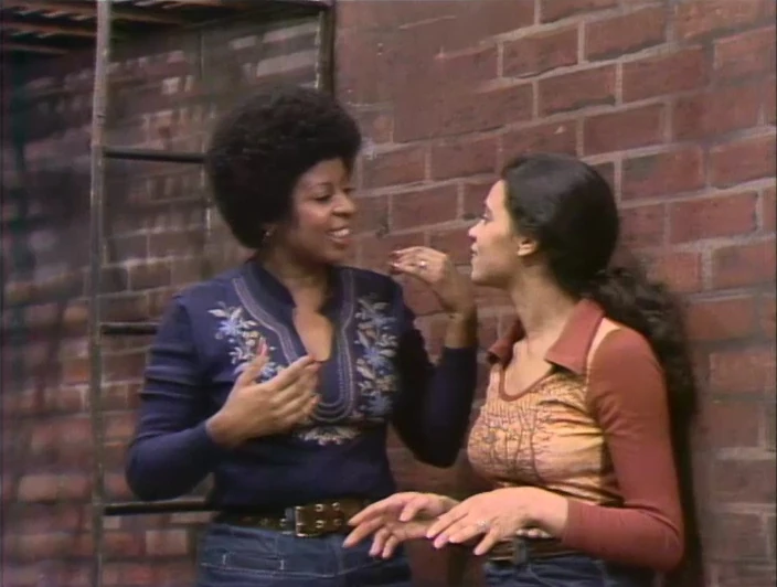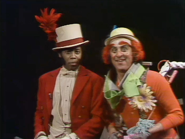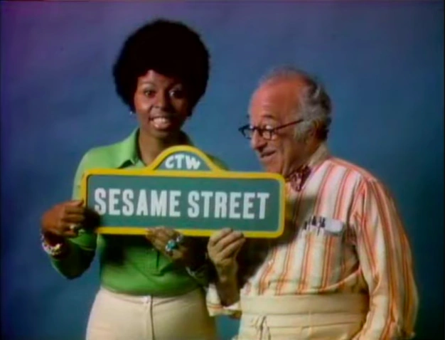 CLOSING SIGNS | Susan and Mr. Hooper hold the Sesame Street sign, and Gordon holds the Children's Television Workshop sign. |