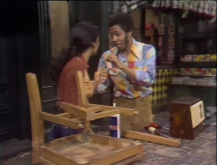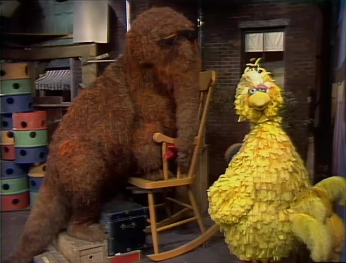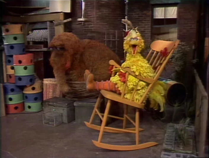SCENE 4 | Big Bird surprises Mr. Snuffleupagus with a special gift - a large rocking chair whittled by his Grampy Bird. The gift proves to be too large, as Snuffy is unable to situate himself onto it. Big Bird is disappointed, having wished his pal could sit in the chair while he sits in his nest. Snuffy gets an idea... |