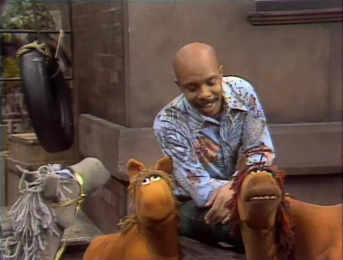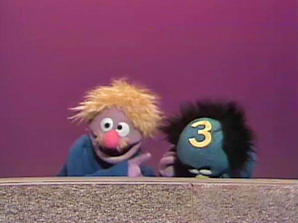 Muppets | Harvey Kneeslapper is looking down and saying "Three sticks!" A man asks "Three sticks where?" Then Harvey says "3 sticks right here!" and sticks a number 3 on the man's head. (First: Episode 0570) |
