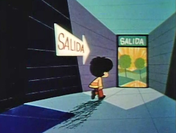 Cartoon | The word SALIDA exits through a white square. (First: Episode 0588) |