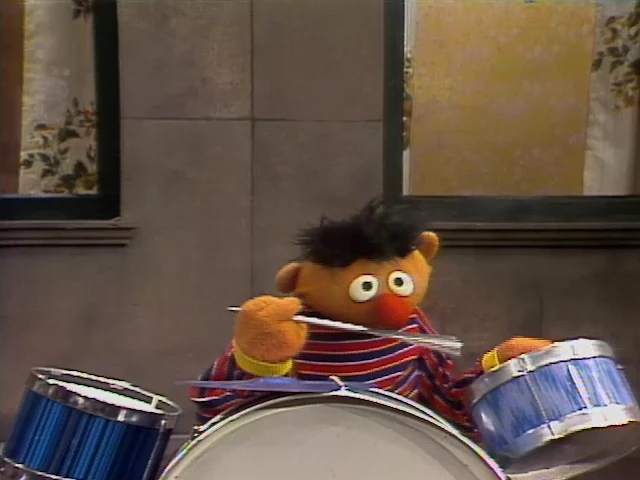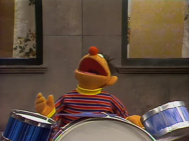 SCENE 5 | Ernie sets out his drum set to play outside, but notices Bob and Maria engaged in quiet activities. He thinks his drumming will disturb them, but notices they aren't bothered by the loud sounds of the kids playing, airplanes, or traffic. He starts playing his drums when the adults ask him to keep down the noise. "I guess it's all in what you're used to," sighs Ernie, tossing his drumsticks away. |