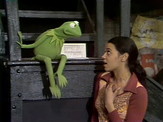 SCENE 4 | Kermit studies a book of Spanish phrases. Maria helps him with his pronunciation of, "Buenos días, ¿cómo estàs?" and rewards his efforts with "a beso." Kermit comments, "It's not an easy language there, but ah... it's worth it when you learn." |