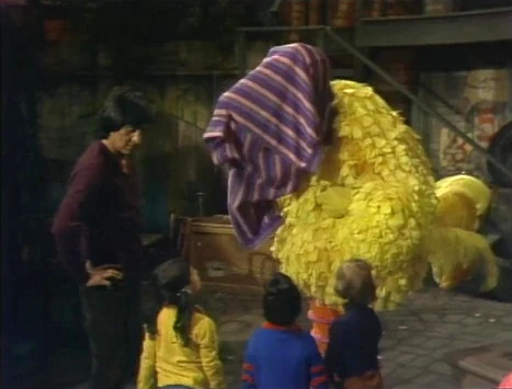 SCENE 3 | Luis and the kids put on pullover sweaters when the weather starts to get chilly. Big Bird has much difficulty getting one on, until Luis and the kids point out that his feathers keep him warm enough. |