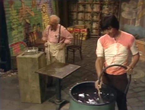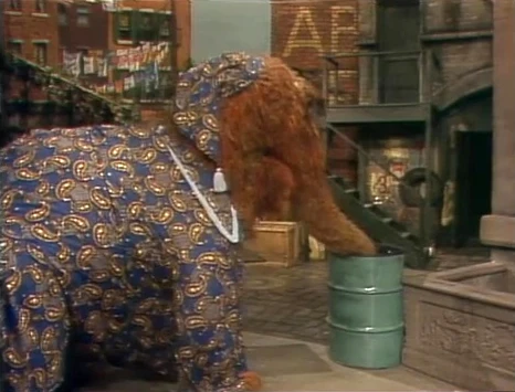 SCENE 1 | It's twilight on Sesame Street. Luis fills a large barrel with water to rinse it out, while Mr. Hooper brings out a bowl of water to wipe down the outdoor tables. They both clear the area when Mr. Snuffleupagus wanders by, dressed in his new pajamas. He's getting ready for bedtime and is very thirsty. He considers visiting Big Bird for a drink when he spots the containers of water left behind in the yard. He slurps up the bowl of water, but needs more, so he drinks all the water in the barrel. Still thirsty, he takes the most water from the pool in Oscar's trash can. Finally sated, Snuffy makes his way back to his cave, singing a line from the "Aba Daba Honeymoon" refrain to himself. |