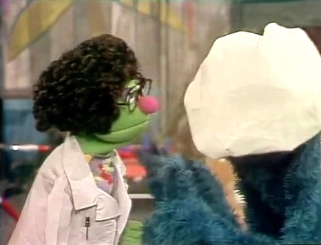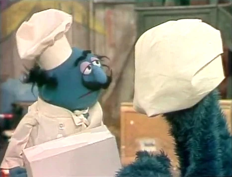 SCENE 1 | Cookie Monster tells Maria heβs just been hired as a baker's assistant, but heβs wearing his bakerβs toque over his eyes (having heard others say it's "chez elegant" to have the fluffy part covering his face). Since he cannot see, he believes he can identify the baker by asking them a series of questions. |