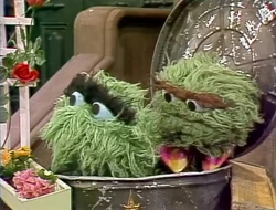 SCENE 1 | Maria walks down the street and stops in her tracks when she notices Oscar's trash can, which has been beautified with flowers, a clean picket fence, and a welcome mat. A piano version of the Sesame Street Theme plays from inside. She rings the doorbell and Oscar appears, neatly-dressed and talking politely. He explains that he's expecting a visit from his brother Ernest, whom he holds a grudge against for being the favorite kid in their family. Oscar plans to get even with Ernest by acting nice and making him comfortable (even though he can't stand it either). |