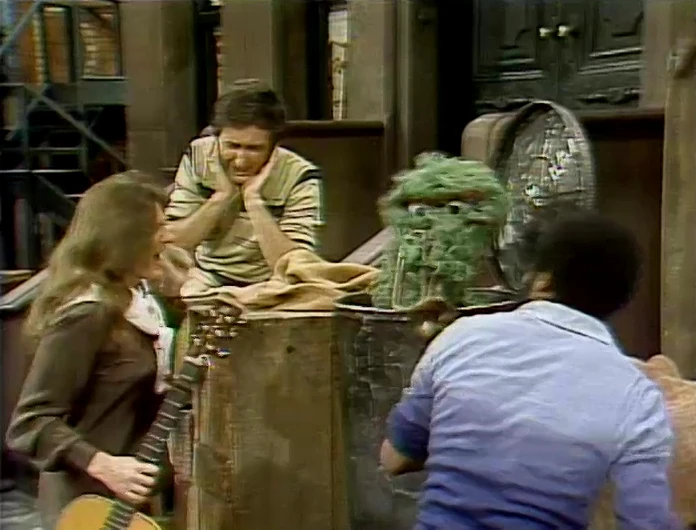 SCENE 3 | Bob and David take Judy to the stoop of 123 Sesame Street, thinking it's a quiet place to practice. Instead, Oscar loudly practices his horn playing for a concert of his own. He can't stand her guitar playing, but he refuses to stop practicing himself. He agrees to play in his can, just as long as Judy practices anywhere else but the steps. David and Bob situate her on top of Oscar's trash can, preventing him from getting out. |