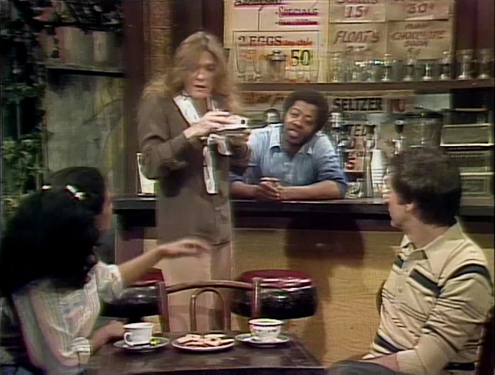 SCENE 1 | Judy Collins stops by Hooper's Store, and David notices that her voice sounds a tad hoarse. She agrees and claims that she still has to practice for a concert she's performing tonight. Bob suggests some hot tea with lemon will soothe her throat, while Maria insists she needs hot milk and honey. David gives her both, which each seem to work a little. David thinks she could use some ice cream instead and serves her a bowl. Soon after, Judy's voice is back in its normal condition, but after all the remedies she's no longer in need of lunch. |