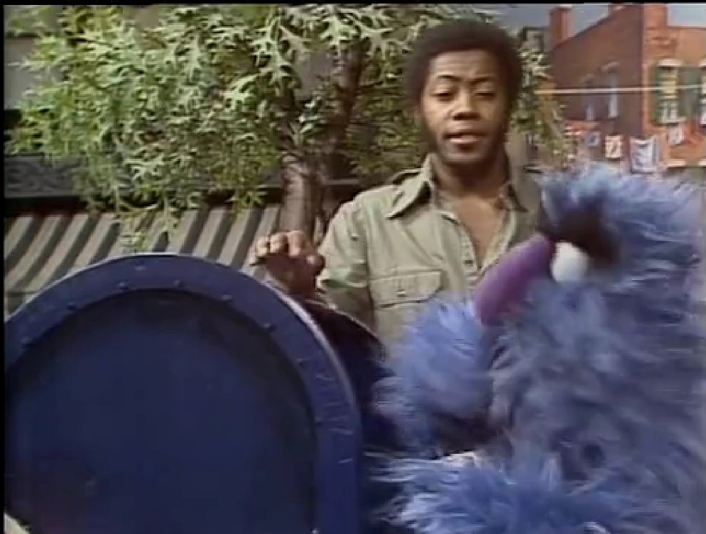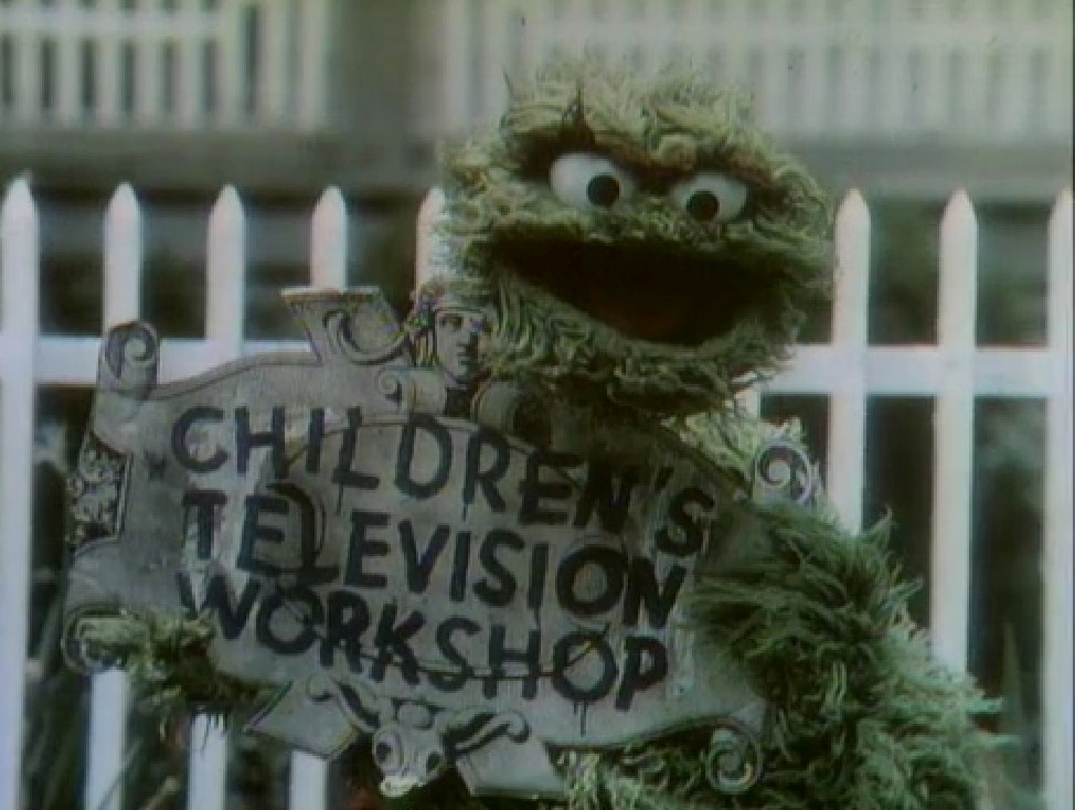 CLOSING SIGNS | David holds the Sesame Street sign, while Oscar holds the CTW sign. |
