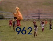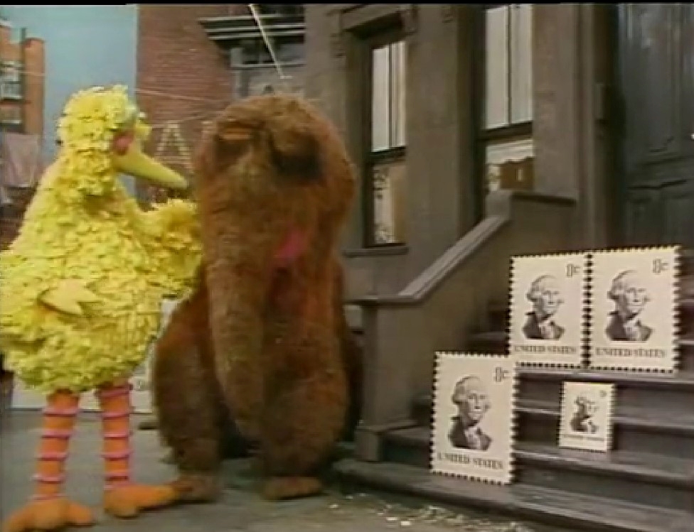 SCENE 3 | Mr. Snuffleupagus shows Big Bird some oversized postage stamps (depicting George Washington) on the stoop, which they use to play a game of "One of These Things." After showing that one stamp is (relatively) smaller than the others, Big Bird helps him put one of the stamps onto a mail-order card for a Little Orphan Annie ring. |
