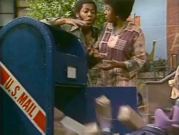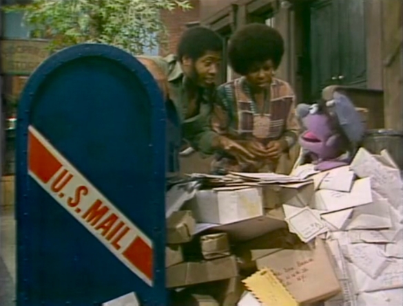 SCENE 1 | Luis catches David on his way to the mailbox on the corner, and adds some items to Davidβs already big load since he has to stay at the Fix-it Shop. Susan meets up with David on his trip down the street with her own armful of packages. They both meet a jolly postman (Jerry Nelson) who is new to the job on Sesame Street. He is absolutely thrilled when receiving more of David and Susan's mail, which he adds to his already-bulging mailbag. When he opens the mailbox to empty it, the mailman is met with a torrent of letters and packages which completely engulfs him. David asks if he's all right; the postman couldn't be better - this is the most mail he's ever collected! |