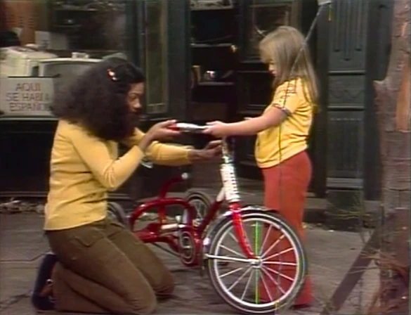 SCENE 5 | At the Fix-it Shop, Laurie helps Maria adjust the seat and handlebars of a tricycle. |