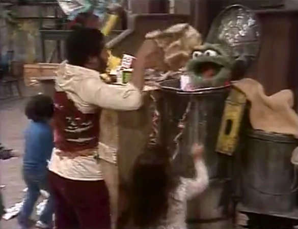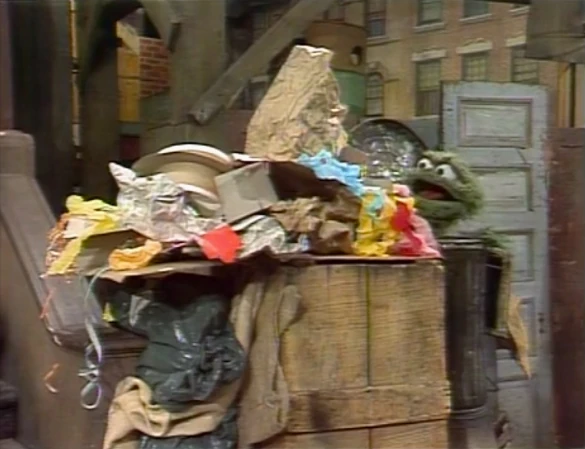 Oscar has a big pile of trash near his trash can, which becomes small after the wind blows. Oscar is delighted; now there's a big mess on the street! |