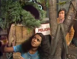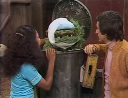 SCENE 2 | Bob and Maria notice a “PELIGRO” sign on Oscar's trash can, and observe loud crashes and smoke coming from it. Oscar says he’s knocking down his walls just to make a mess, and has hired Biff and Sully to help out. They have trouble getting the wall between the conservatory and den down and recommend blasting it out. Oscar doesn't heed Biff's warning about keeping his distance, so he ends up getting blasted out of the can and into a nearby tree. (Biff: "Oscar, you ding-a-ling, I told ya not to stand too close!") Dangling upside-down, Oscar says next time he’ll use a parachute. |