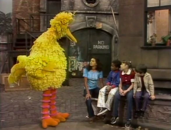 CLOSING SIGNS | Big Bird holds the Sesame Street sign, and Maria and Bob hold the Children's Television Workshop sign. |