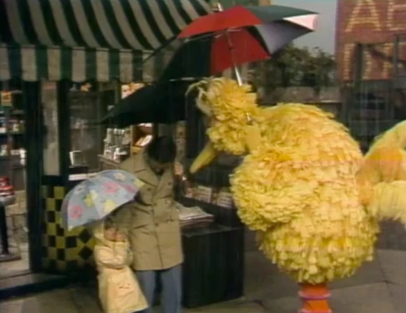 Cast | Bob helps Laurie get properly dressed to go out in the rain to meet Big Bird. (First: Episode 0928) |