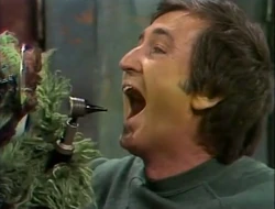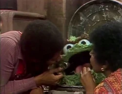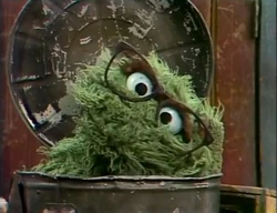 SCENE 4 | Still bothered by the others’ activities, Oscar comes out of his can as a conductor by the name of "the Great Grouchanini." The gang lines up and he assigns them specific notes as part of the choir for his concert titled, "All of Sesame Street Sings." Oscar instructs them not to sing unless he points to them with his baton, but he instead chooses to point to the doors, the sky, and other silent things. They catch on to his trick, and when Oscar leaves to "conduct" his kitchen the others startle him by loudly singing their notes at the same time into his can. |