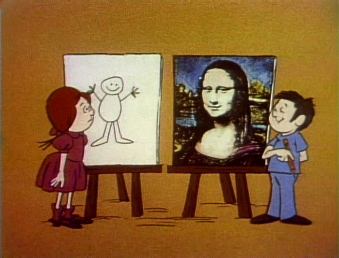 Cartoon | A girl draws her version of a (stick-figure) man. A boy draws his version of a woman - the Mona Lisa. (First: Episode 0780) |