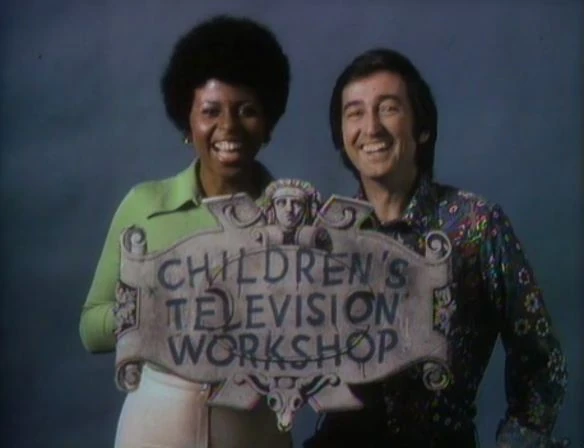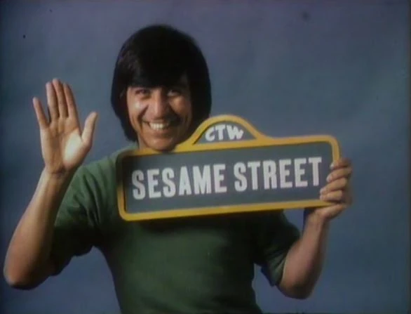 CLOSING SIGNS | Luis holds the Sesame Street sign, and Susan and Bob hold the Children's Television Workshop sign. |