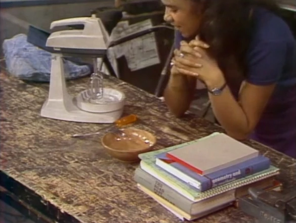 SCENE 6 | The Amazing Mumford poofs himself to the Fix-It Shop, where Maria, having wasted time on checkers earlier, is frantically trying to catch up on many things - fixing a mixer for Mrs. Carver, eating lunch, and doing her homework before class starts soon. Mumford waves his wand and magically fixes the item, completes her homework, and finishes her lunch (as well as cleaning the bowl). She thanks him for the thought, but wants him to undo the trick; she can't get paid if she doesn't do the work herself, she won't learn anything if she doesn't do the homework, and she's still hungry even though the food is gone. Mumford reverses the trick, but still wishes he could help her in some manner. He instead poofs up a vase of pretty flowers to make Maria's job a little more pleasant. |