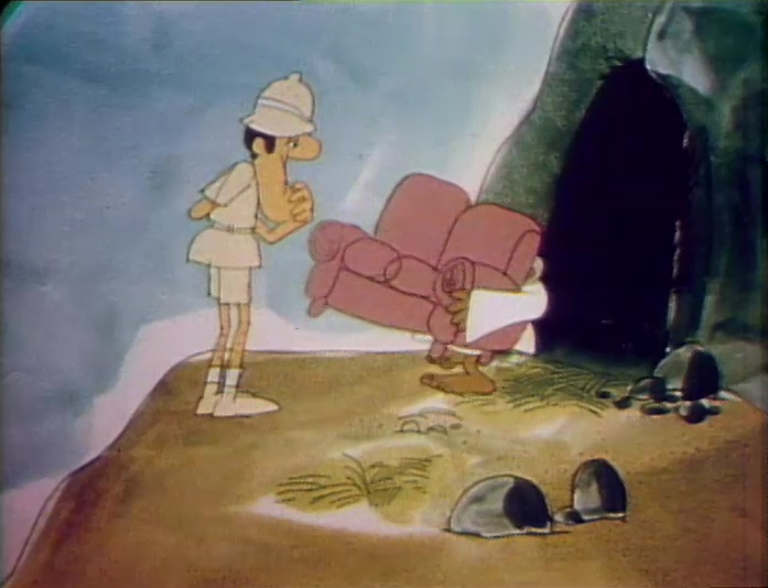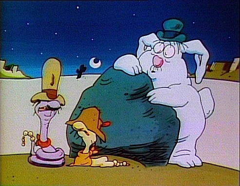 Cartoon | Two cowboy rattlesnakes discuss the difference between here and there, while trying to avoid a sneezing rabbit. Artist: Bud Luckey (First: Episode 0796) |