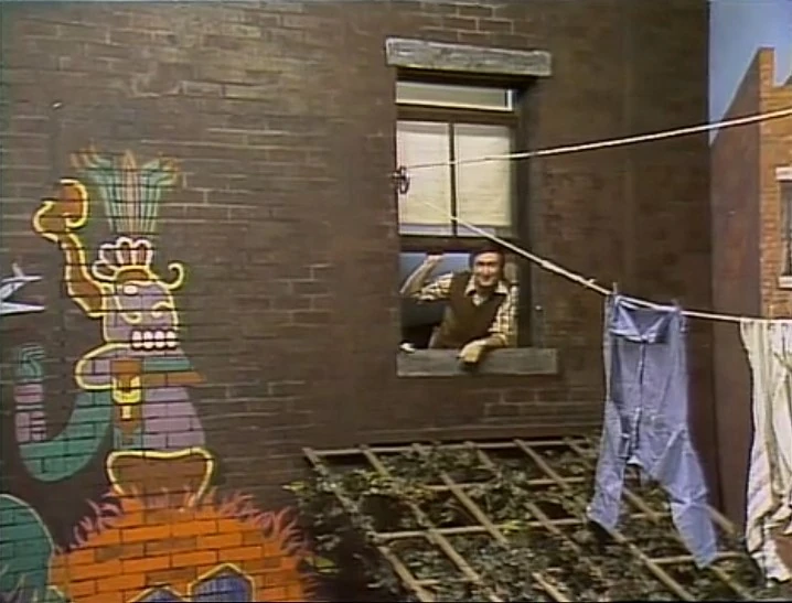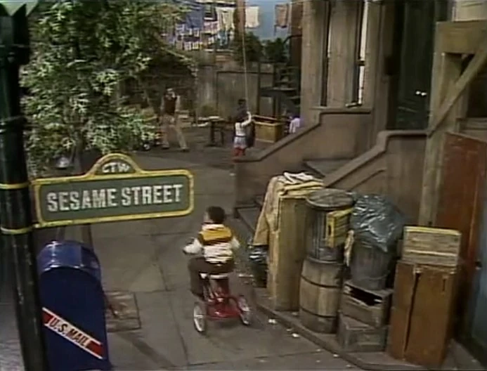 SCENE 1 | Maria lounges on the fire escape when she invites the viewer to pretend they’re up with her to look at Sesame Street from her angle. She sees Mr. Macintosh selling fruits, waves at David, sees Bob at his window, and chats with Big Bird. |