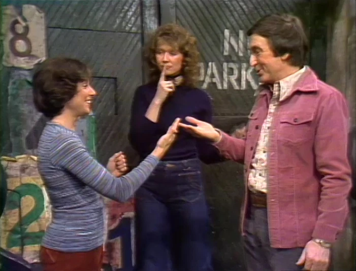 SCENE 4 | Everybody works on a crossword puzzle together. Linda takes a break to announce the day's sponsors in sign language, with Bob chiming in for the CTW slogan. |