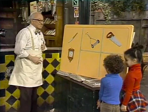 SCENE 2 | Mr. Hooper and the kids play a βHere Are Some Thingsβ game using pictures of things that can cut and a wall clock. |