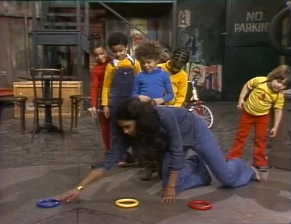 SCENE 4 | Maria plays a game with the kids, instructing them to jump over different-colored rings. Mr. Hooper announces the sponsors. |