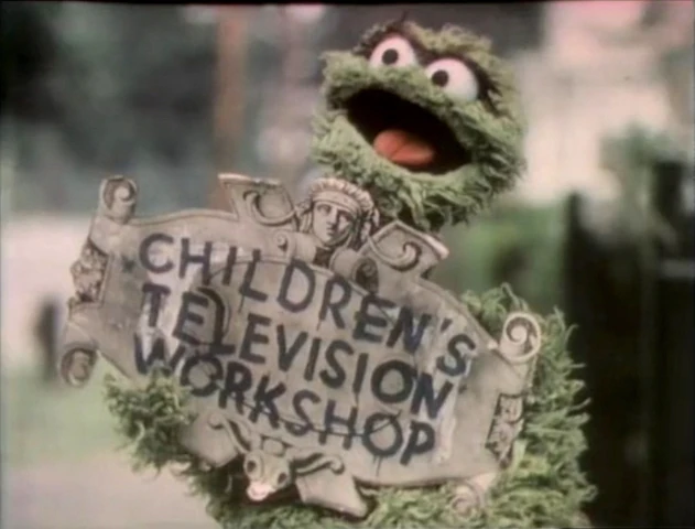 CLOSING SIGNS | Kermit and a kid hold the Sesame Street sign, and Oscar holds the Children's Television Workshop sign. |