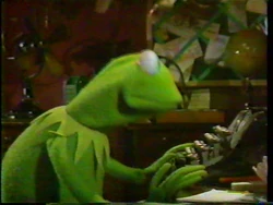 Tug goes up to Kermit's study and asks him to write a story for their show. Kermit writes about Muppet City, where him and Fozzie are detectives in 'Kermit the Frog, Private Eye'. |