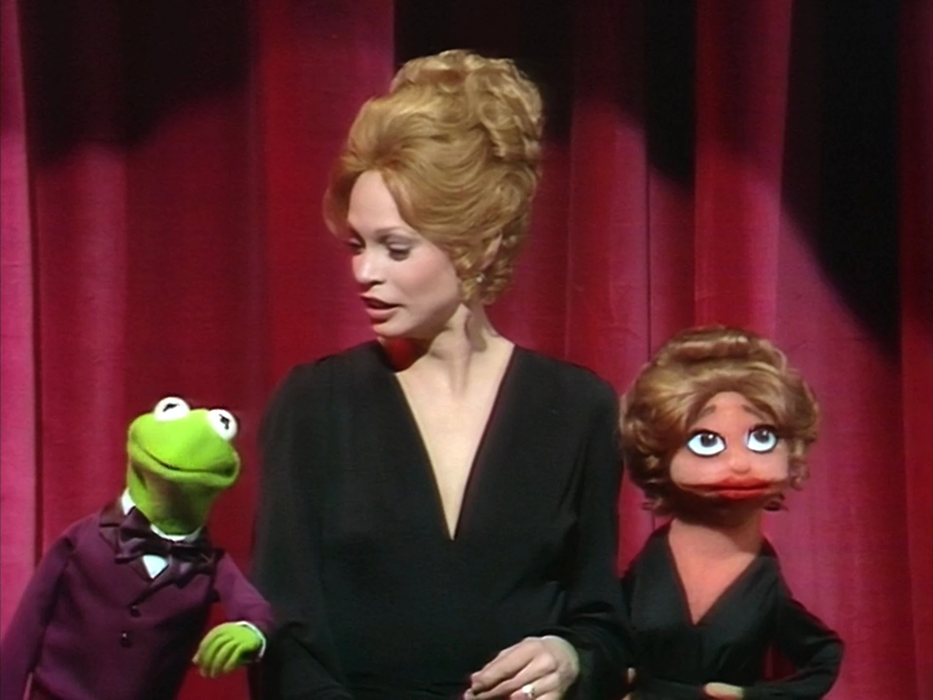 Curtain Call: Kermit bequeaths Juliet with a Muppet likeness of herself. (Note: Although Kermit calls this a tradition, the only other guest star to receive a Muppet likeness of herself at the end of the show would be Connie Stevens in episode 102.) |