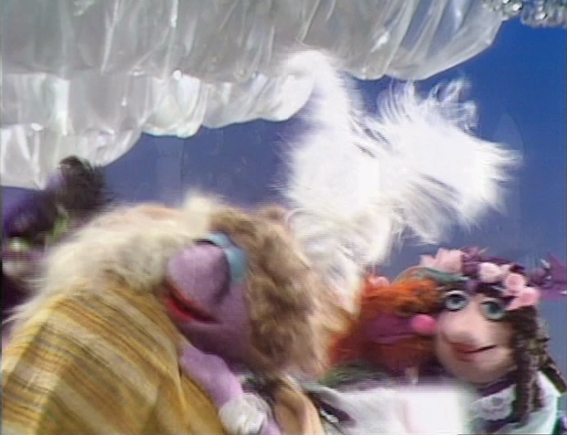 At the Dance: Mildred Huxtetter feels like her feet haven't touched the floor ever since she and George the Janitor started dancing. They haven't; she's been standing on George's the whole time. Miss Piggy, played by Richard Hunt, asks her male pig companion if he prefers Shakespeare to Bacon. He, of course, prefers anything to bacon. Flower-Eating Monster's partner says she doesn't mind if he smokes. So he does. Background couples: Brewster with Trumpet Girl and Mahna Mahna with Wanda. |