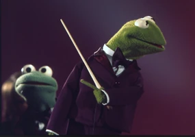 | Kermit gathers the Muppet Glee Club on stage to perform, but when he begins conducting, he is met first by silence and then by a cacophony of different songs, one of which is identifiable as "The Caisson Song." Kermit's suggestion that they all sing the same song is well received, though, and they all settle on their favorite song, "Temptation." Kermit lets "Piggy, honey" take the solo in her first featured performance, and when her cue comes, she marches down the risers and throws herself at Kermit while he conducts, ultimately pinning him to the ground before chasing him offstage. | |