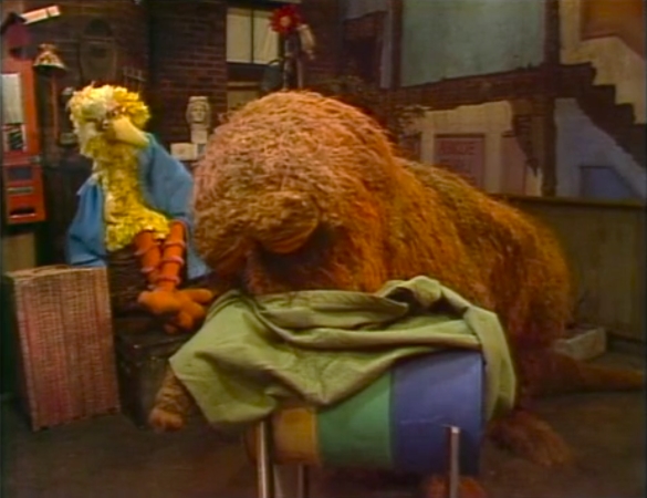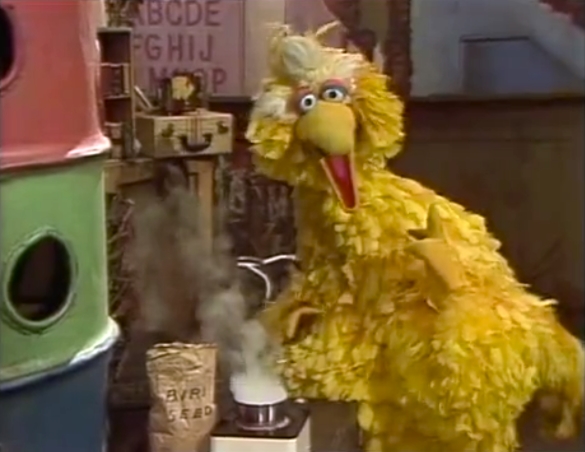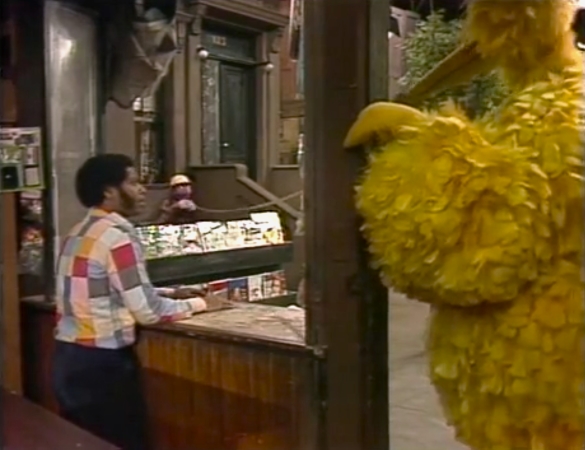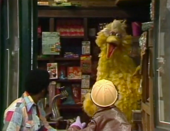 SCENE 4 | Big Bird is boiling some birdseed for a cake and finds that he needs a bigger pot. He rushes to Hooper's, though David has to remind him which is the "fast" door. When he can't remember what the emergency is, Big Bird runs back to his nest and back to the store, forgetting which door is which again. Olivia announces the sponsors as the confused bird continues switching directions. |