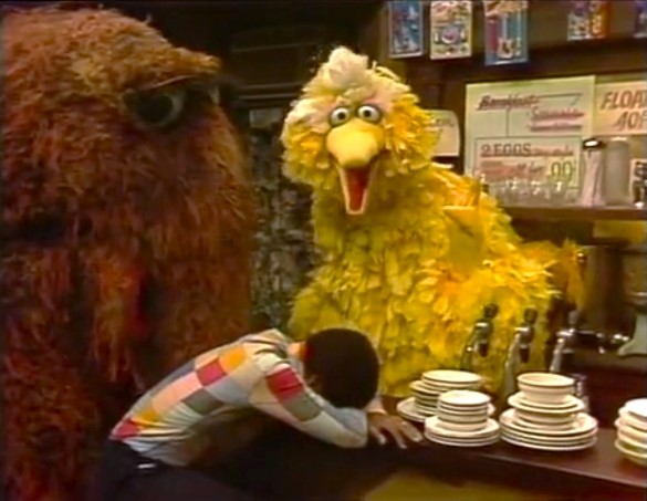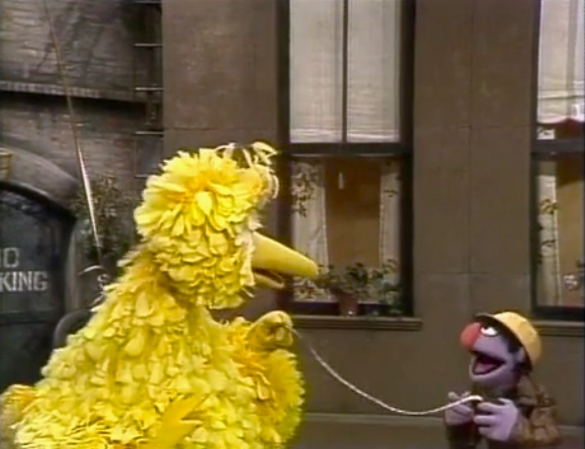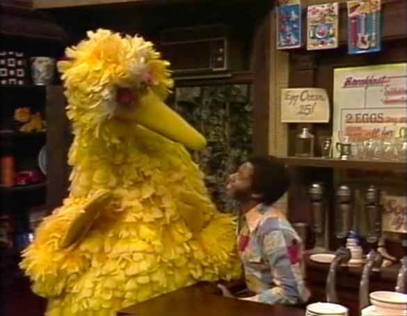 SCENE 3 | David watches in confusion as Biff helps Big Bird use his tape measure to figure out the distance from his nest to the front door of Hooper's Store (122 ft.). When David inqures why, Big Bird explains that it's important for him to know which door to get to if he's in a hurry to the store, such as getting some birdseed for a cake. He demonstrates that he can use the back door (143 ft. away from his nest) for more casual requests like a birdseed malted. Biff marvels at the bird's efficiency before leaving with Big Bird, while David attempts to comprehend what he just witnessed. |