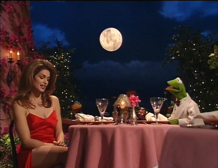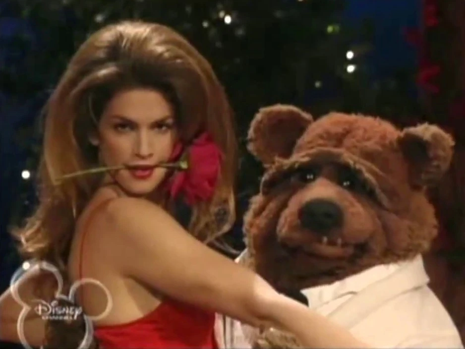 Clifford wraps up the show, thanking special guest star Cindy Crawford, who expresses her enjoyment working with the Muppets (except Stu). Cindy zaps Stu with her eyes, making him disappear in a puff of smoke. Bobo enters, declaring his affection for Cindy and suggesting they dance the bossanova. The two start dancing to music and the other Muppets join in. |