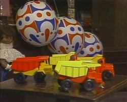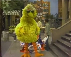 SCENE 1 cont'd | Sure enough, Big Bird comes in to buy a ball for his upcoming trip to the beach but the Count talks him out of it, claiming nobody plays with them anymore and lists the “reasons” why. He persuades Big Bird to save his money and dig in the sand instead, so Big Bird finds a pail and shovel to purchase. The Count insists that he dig with his hands (or rather wings and feathers), as the pail “barely holds any sand at all” and recommends he uses a big bucket. Big Bird agrees and requests one, and the Count (excited that his plan is working) informs him that they don’t have any and sends the confused bird over to the hardware store. Once he’s gone, the Count sighs of relief. |