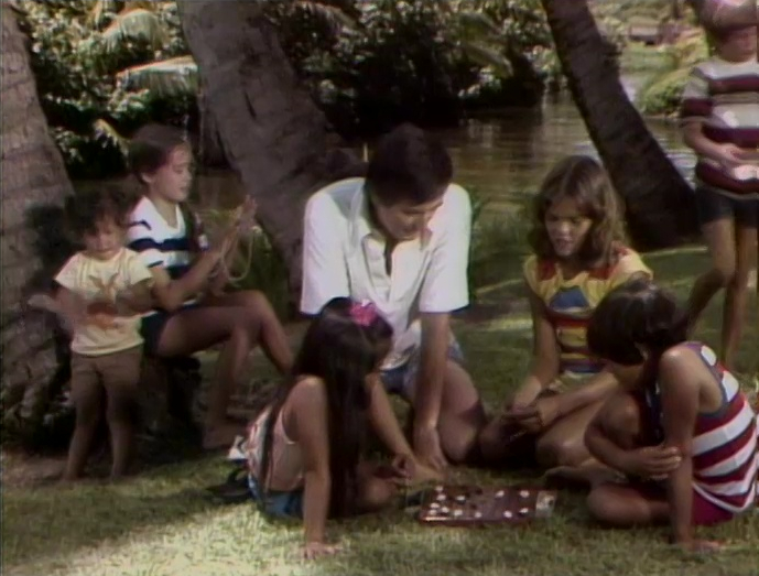 SCENE 10 | Bob learns about some of the Hawaiian games and toys that the kids like to play there. He watches and joins the kids in playing konane (a game similar to checkers), a lawn bowling game called ulumaika, a racing wheel, and a game with string that's similar to cat's cradle. |