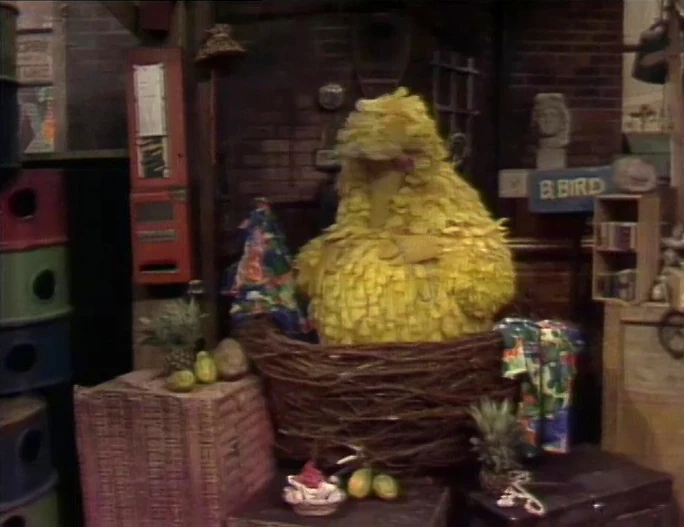 SCENE 4 | Big Bird sleeps in his nest surrounded by the various things he brought back from Hawaii. Olivia announces the sponsors. |