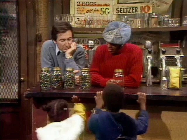 SCENE 6 | In Hooper's Store, Bob and David sing "Here Are Some Things" and help the kids classify empty and full jars of marbles. |