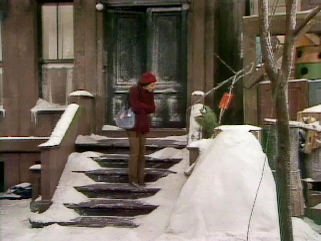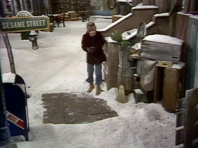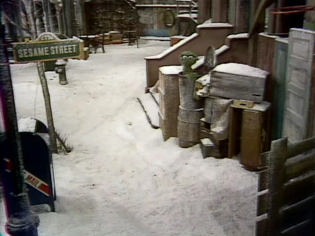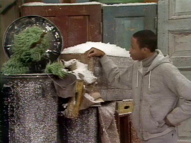 SCENE 2 | Oscar the Grouch observes the snow on Sesame Street from his can. It's untouched; hasn't been shoveled or plowed yet, so it neatly covers all the dirt and litter that can otherwise be seen in the neighborhood. He decides to dirty it up by throwing ashes all from his furnace all over the place. Jay makes his way down the street, but he's struggling; slipping and sliding all over the place. When he reaches Oscar's can, he thanks him for throwing some ashes down because it makes walking on the snow and ice easier; not everyone would have been so thoughtful. |