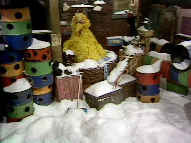 SCENE 1 | Big Bird wakes up in his nest all excited because he planned for snow last night by setting out his shovel, his warm clothes, and sled. His excitement diminishes when he looks around to find all those items covered under mounds of snow. |